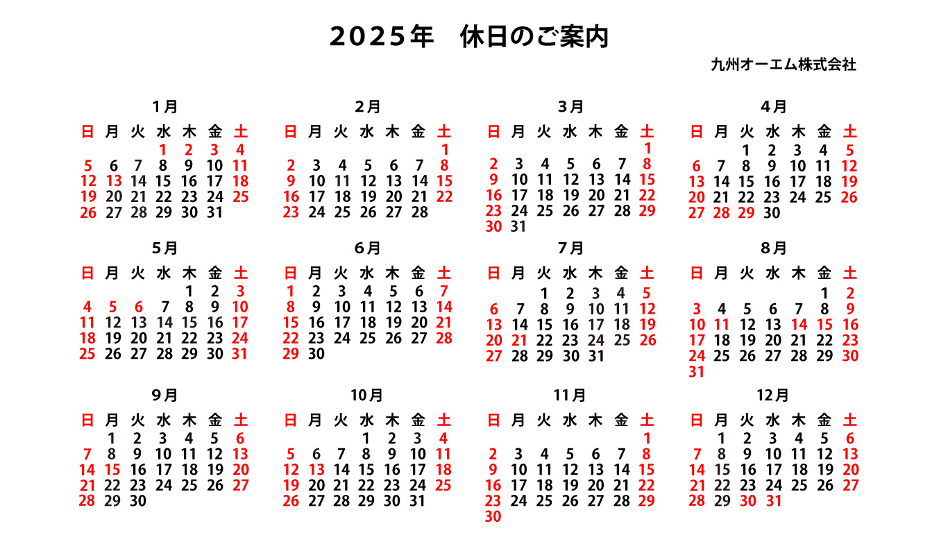 2025年休日のご案内